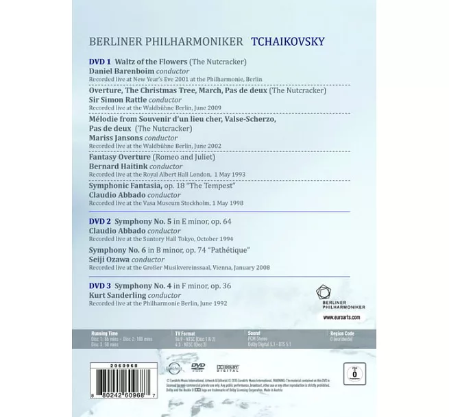 這一套DVD讓愛樂者一次體驗柏林愛樂與偉大的指揮家,如:阿巴多、巴倫波英、海汀克、楊頌斯、小澤征爾、拉圖、桑德林詮釋的柴可夫斯基演出實況,曲目包括最受歡迎的第四到第六號交響曲《悲愴》,以及甚少演出的幻想序曲《暴風雨》。其中值得注意的是,同時收錄楊頌斯與拉圖分別在2002年、2009年演出的芭蕾音樂《胡桃鉗》〈雙人舞〉,愛樂者不妨比較兩名指揮大師對於同一曲目的不同角度詮釋。