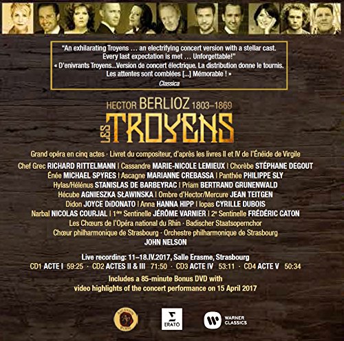 這套全曲出自於2017年四月於法國史特拉斯堡的實況演出,由約翰.尼爾森指揮十多位優異獨唱家及史特拉斯堡愛樂(指揮讚譽樂團「結合了德式紀律與法式聲響之美」),外加三個國家級合唱團,總共超過兩百五十人的龐大編制。美國指揮家尼爾森乃是當代最重要的白遼士歌劇權威,早在1973年於紐約卡內基廳、隔年於紐約大都會歌劇院指揮全本《特洛伊人》而享譽樂壇。歷經四十多年,尼爾森將畢生功力注入於此場演出,呈現極其壯麗又豐沛的音樂史詩。